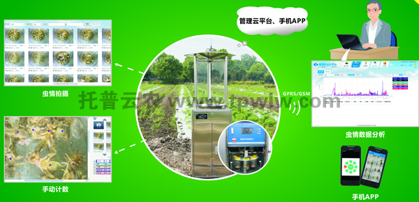 遠(yuǎn)程拍照式蟲情測(cè)報(bào)燈利用移動(dòng)無線網(wǎng)絡(luò),定時(shí)采集現(xiàn)場(chǎng)圖像,自動(dòng)上傳到物聯(lián)網(wǎng)監(jiān)控平臺(tái),平臺(tái)自動(dòng)記錄采集數(shù)據(jù),形成蟲害數(shù)據(jù)庫??捎脠D表、列表形式給農(nóng)業(yè)專家進(jìn)行遠(yuǎn)程診斷。工作人員可隨時(shí)遠(yuǎn)程了解田間蟲情狀況,制定防治措施。通過手機(jī)APP,可遠(yuǎn)程查看田間視頻信息,田間墑情、蟲情、環(huán)境氣象等數(shù)據(jù),也可在手機(jī)上直接進(jìn)行設(shè)備遠(yuǎn)程管理或在線專家咨詢。
