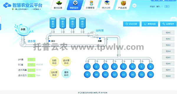 可在托普系統(tǒng)云平臺(tái)上遠(yuǎn)程設(shè)置相應(yīng)的施肥及灌溉日期、使用總量、工作時(shí)長(zhǎng)等參數(shù),實(shí)現(xiàn)區(qū)域用水、用肥的計(jì)量管理;現(xiàn)場(chǎng)安裝的360°遠(yuǎn)紅外球形攝像頭能夠清晰直觀的看到基地的葡萄長(zhǎng)勢(shì)和周圍的環(huán)境;還可對(duì)灌溉設(shè)施設(shè)備生成定期維護(hù)計(jì)劃,記錄維護(hù)情況,實(shí)現(xiàn)灌溉工程的精細(xì)化維護(hù)運(yùn)行管理。不僅能夠充分發(fā)揮現(xiàn)有的節(jié)水設(shè)備作用,優(yōu)化調(diào)度,提高效益,更加節(jié)水節(jié)能,降低灌溉成本,提高灌溉質(zhì)量,將使灌溉更加科學(xué)、方便,提高管理水平。