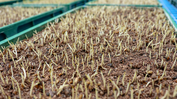 在育秧工廠內(nèi),一條機(jī)械化流水線設(shè)施貫穿車間,車間工人只需要將催芽框放置在履帶之上,即可實(shí)現(xiàn)自動(dòng)填土、播種、藥劑消毒等一系列操作,隨后用平板車將催芽框轉(zhuǎn)移至恒溫恒濕培養(yǎng)室,靜待數(shù)日,即可得到生機(jī)盎然的新生嫩芽。