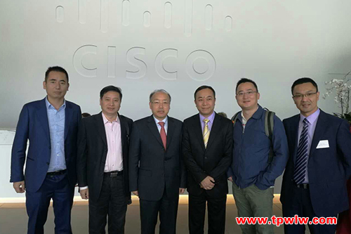 周?chē)?guó)輝廳長(zhǎng)(左三)、陳渝陽(yáng)董事長(zhǎng)(右一)一行在思科