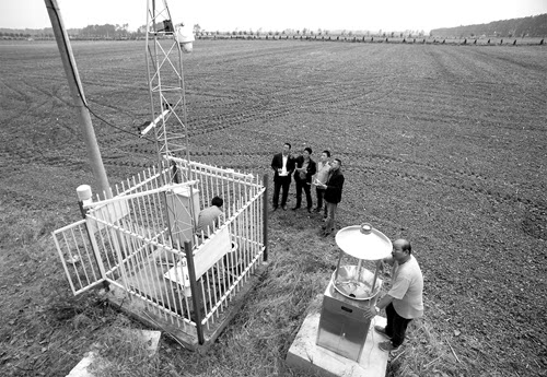 10月18日,懷遠(yuǎn)縣種糧大戶尚躍(左二)和農(nóng)技人員在對(duì)物聯(lián)網(wǎng)設(shè)備進(jìn)行檢修維護(hù)。