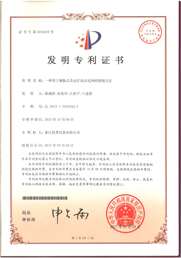 - 托普云農(nóng)又喜獲發(fā)明專利發(fā)表日期:2017-04-14 來源:托普云農(nóng) 瀏覽次數(shù):4455次近日,我司托普云農(nóng)又喜獲一項發(fā)明專利。據(jù)悉,該發(fā)明專利名稱為“一種用于頻振式殺蟲燈高壓電網(wǎng)的繞制方法”,發(fā)明專號為ZL201310472343.3。相較于傳統(tǒng)的殺蟲燈繞制方法,“一種用于頻振式殺蟲燈高壓電網(wǎng)的繞制方法”是一種用專門設(shè)計的螺旋繞線機實現(xiàn)殺蟲燈高壓電網(wǎng)繞線的方法。該發(fā)明專利于2013年10月9日向國家知識產(chǎn)權(quán)局申請,并于2017年3月29日正式得到授權(quán)。據(jù)業(yè)內(nèi)專家評價,該專利由于電網(wǎng)間距由螺桿螺距保證,使得繞制后的電網(wǎng)間距均勻一致。此外,繞制方法操作方便,繞制效率高且繞線緊致不易松落造成短路,具有良好的普及運用價值。