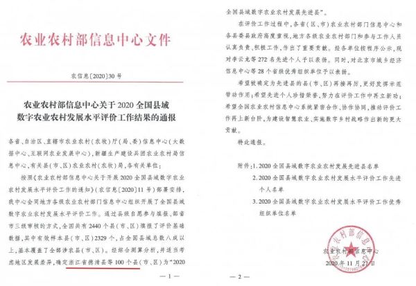 我國已持續(xù)多年開展縣域數(shù)字農(nóng)業(yè)農(nóng)村發(fā)展水平評價工作,這已經(jīng)成為推動縣域數(shù)字農(nóng)業(yè)農(nóng)村發(fā)展的有力杠桿。2020年底,由農(nóng)業(yè)農(nóng)村部市場與信息化司會同農(nóng)業(yè)農(nóng)村部信息中心共同發(fā)布的《2020全國縣域數(shù)字農(nóng)業(yè)農(nóng)村發(fā)展水平評價報告》(以下簡稱“報告”)顯示,2019年全國縣域數(shù)字農(nóng)業(yè)農(nóng)村發(fā)展總體水平達36.0%,較上年提升3個百分點。報告還確定德清縣等100個縣(市、區(qū))為“2020全國縣域數(shù)字農(nóng)業(yè)農(nóng)村發(fā)展先進縣”,成為各地數(shù)字鄉(xiāng)村建設(shè)的“風(fēng)向標(biāo)”。其中,德清縣在全國2400多個縣(市、區(qū))中以總分全國第一的成績脫穎而出,連續(xù)兩年獲此殊榮。