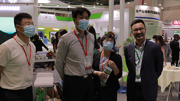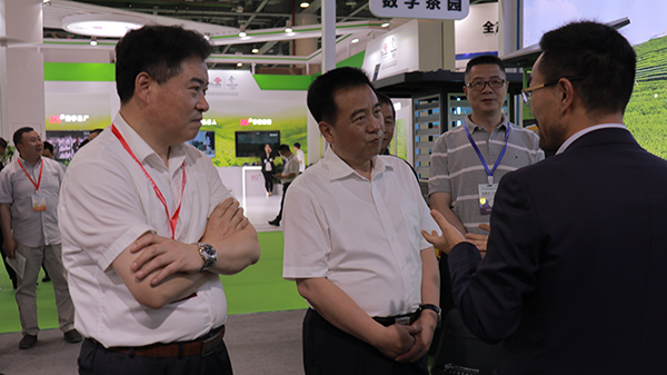 全國農(nóng)業(yè)技術(shù)推廣服務(wù)中心主任魏啟文(左二)、園藝處處長周澤宇(左一)、副處長冷楊(右一)參觀托普云農(nóng)展位