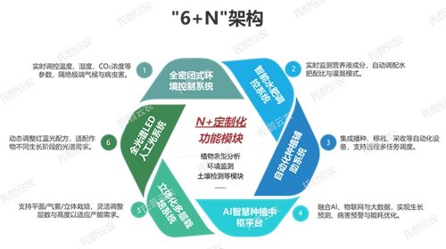 該方案基于"6+N"架構構建:全密閉式環(huán)境控制系統(tǒng)精準調(diào)控溫濕度及CO?濃度,隔絕外界干擾;全光譜LED光系統(tǒng)動態(tài)調(diào)整紅藍光配方適配作物生長周期;立體栽培系統(tǒng)通過平面、多層、氣霧模式靈活適配產(chǎn)能需求;智能水肥系統(tǒng)實時監(jiān)測營養(yǎng)液成分并自動調(diào)配灌溉;自動化設備實現(xiàn)播種、移栽、采收全流程無人化操作;AI中樞整合物聯(lián)網(wǎng)與大數(shù)據(jù),提供生長預測與病害預警;另可擴展植物表型分析、環(huán)境監(jiān)測等N個定制模塊,形成閉環(huán)智能生產(chǎn)體系。